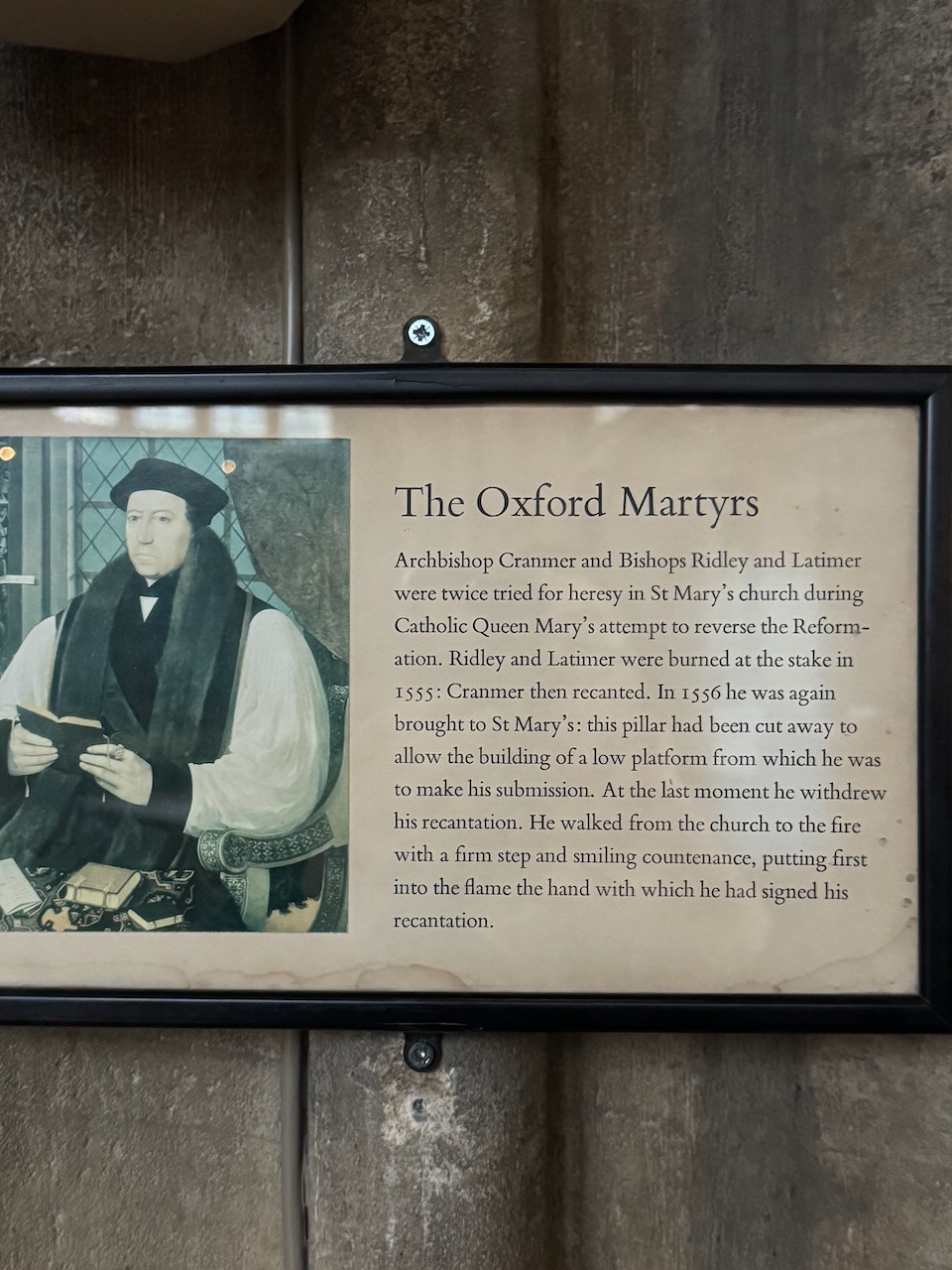 My first happy accident was at the University Church of St Mary the Virgin in Oxford. This was the place Archbishop Cranmer was burnt at the stake as a heretic. The church is spectacular, and had I walked the other way around the pole, I’d have missed the plaque acknowledging the poor martyrs.