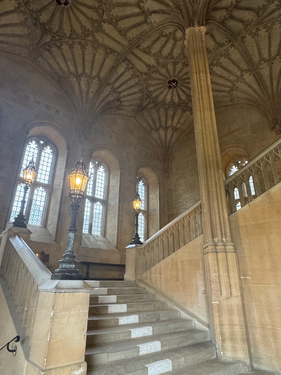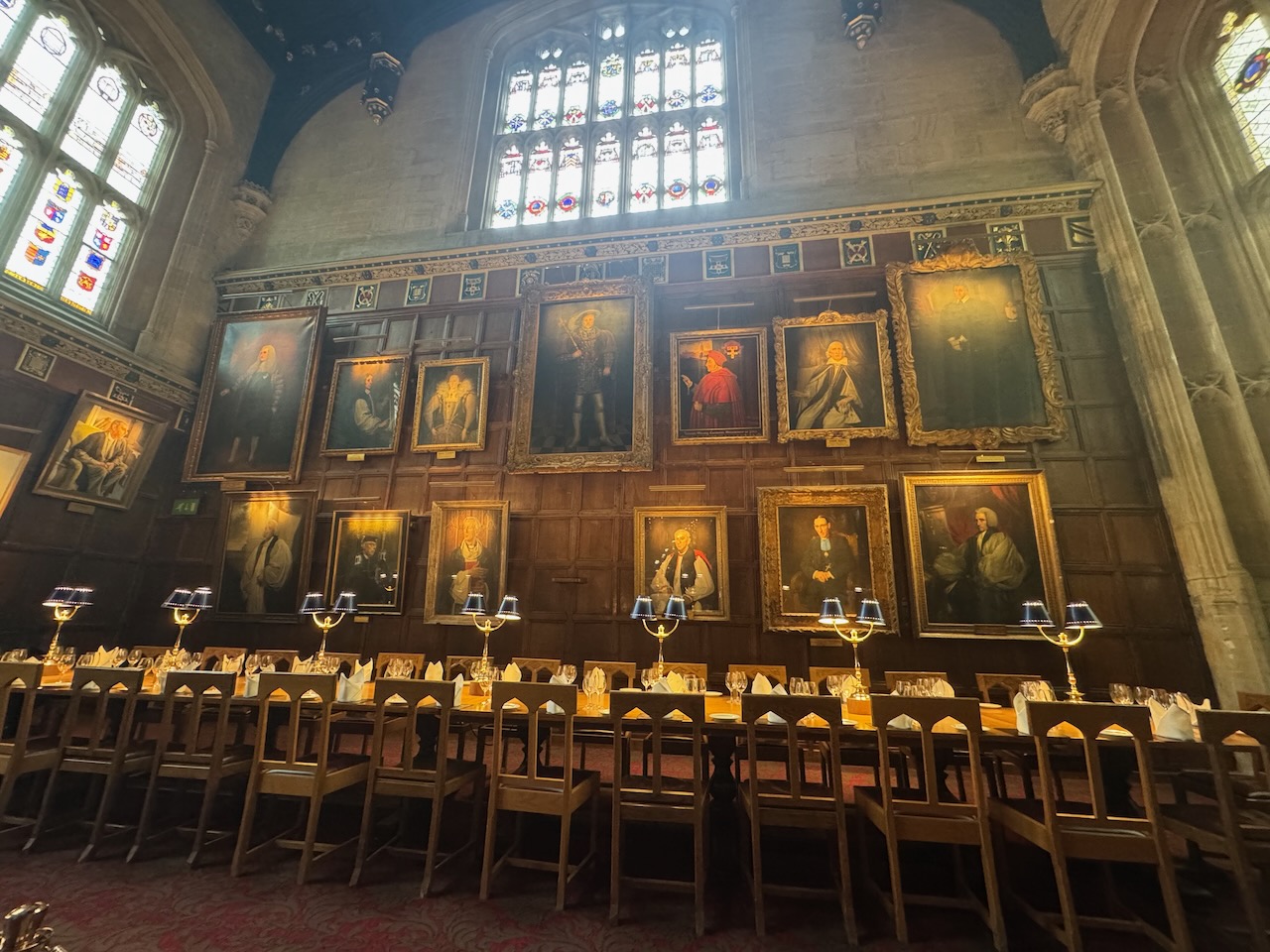The staircase is instantly recognisable as the place Professor McGonagall welcomes Harry, Ron, and Hermione to Hogwarts, but on closer inspection, Cardinal Wolsey’s coat of arms appears in the fan vaulted ceiling. It was here that I realised Wolsey’s relationship to the place. Continuing into the Great Hall, an enormous portrait of Henry VIII hangs above the High Table, next to portraits of Elizabeth I and Cardinal Wolsey. A nearby window features Wolsey and Sir Thomas More.